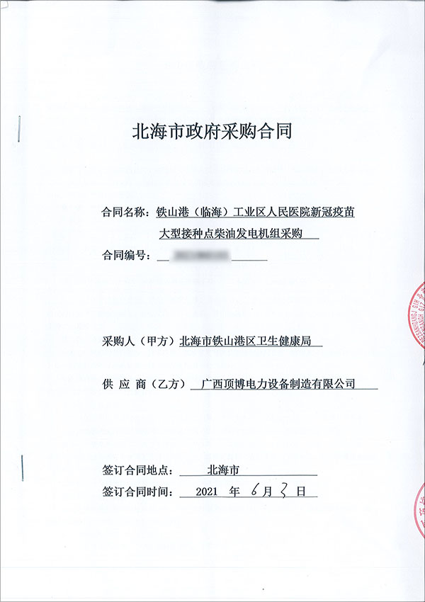 2021年6月3日,廣西頂博電力設備制造有限公司與北海市鐵山港區衛生健康局成功簽訂一臺500KW