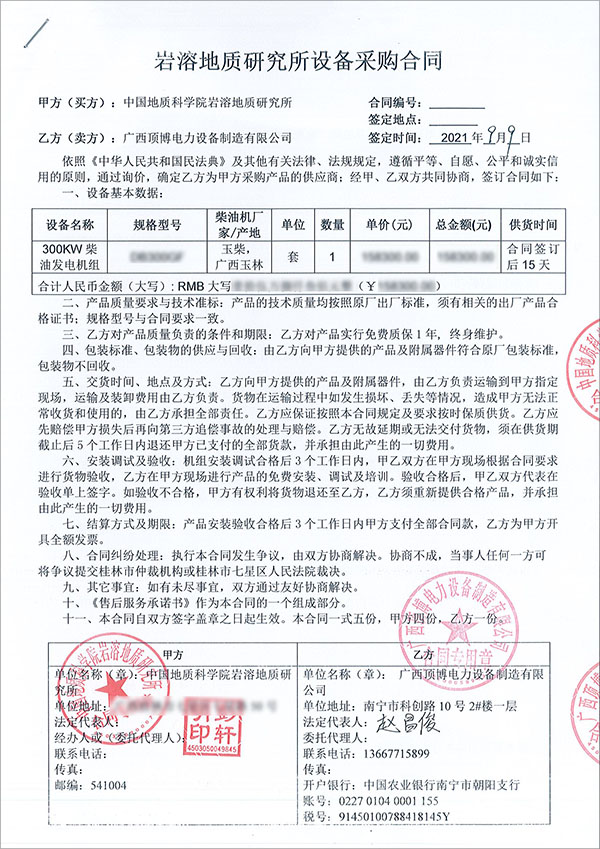 2021年9月9日,廣西頂博電力設備制造有限公司再度傳來捷報,中國地質科學院巖溶地質研究所成功訂購一臺300KW玉柴柴油發電機組,機組配置為玉柴YC6MJ系列柴油機配上海斯坦福發電機及眾智控制模塊,機組具有大扭矩、高可靠、低油耗、低排放、低噪聲、適配性強等特點。